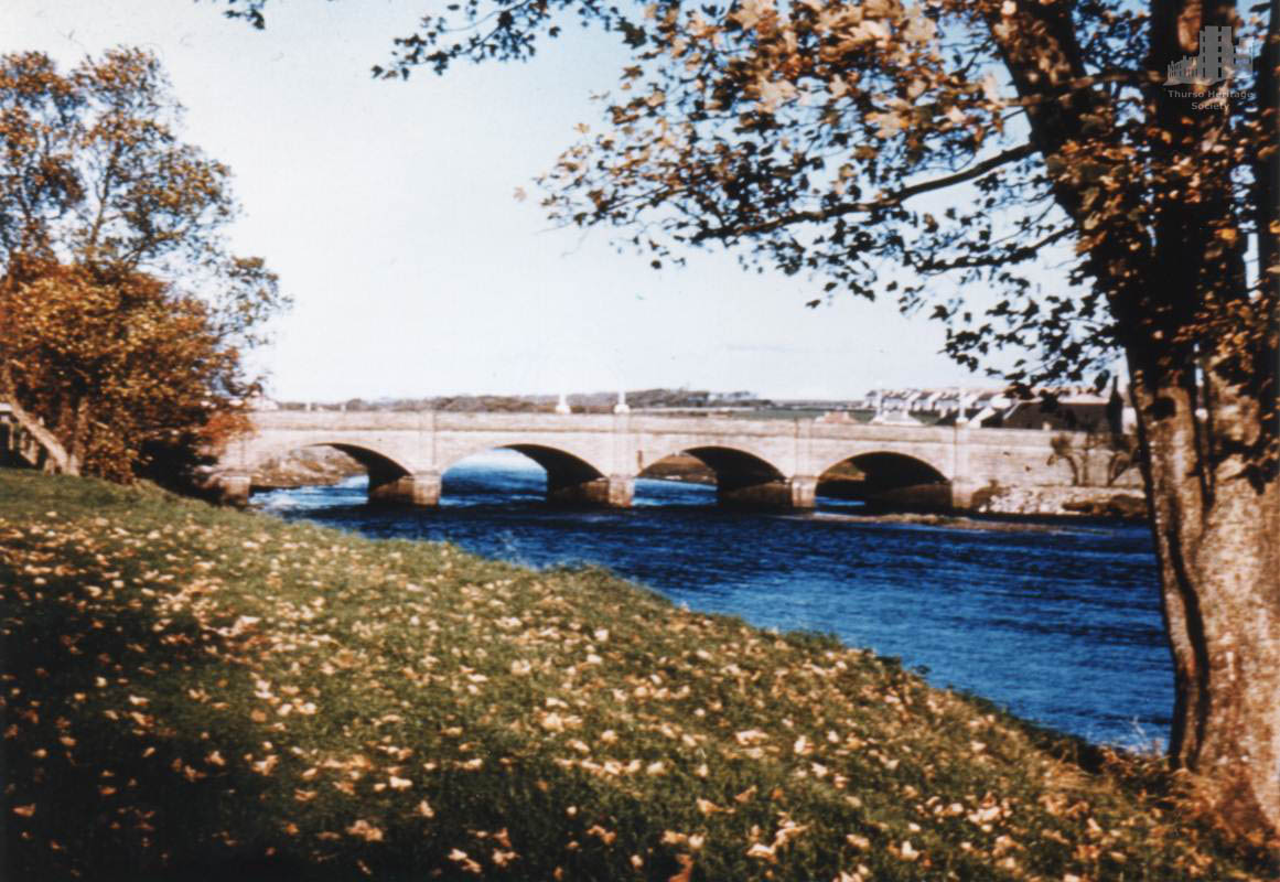 Colour image showing Thurso Bridge taken from The Mall Walk, early Autumn, taken late afternoon. Looking north east.